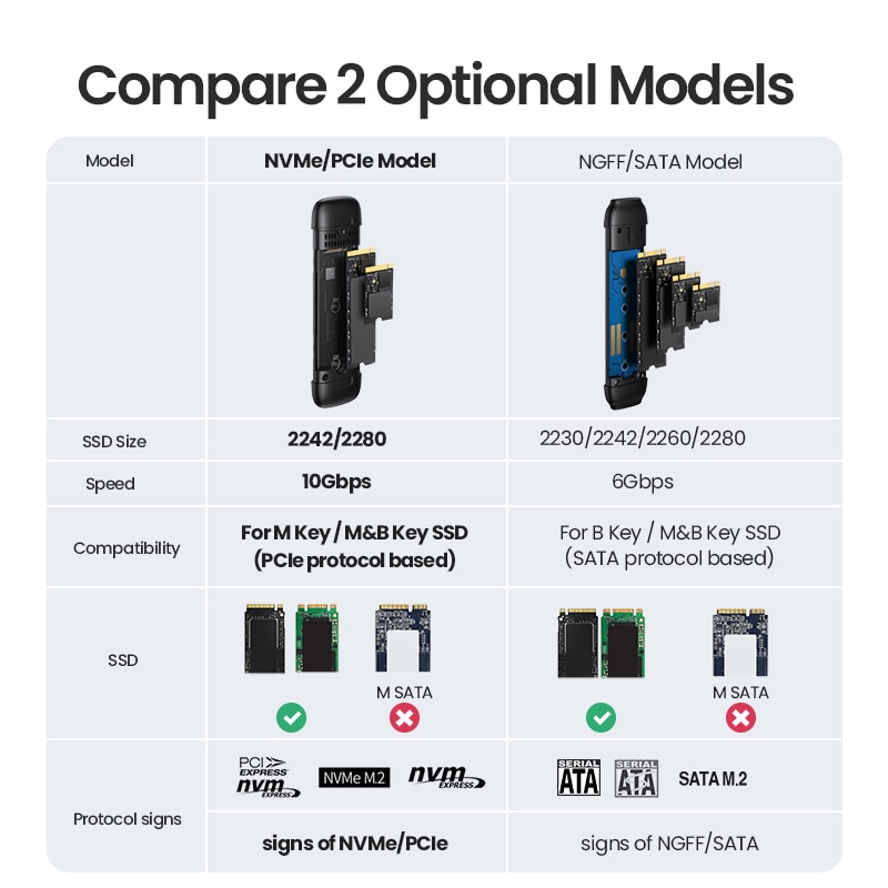 Get maximunm speed & best performance from your SSDSupport 2TB Large Capacity: Robust backup & storage method for youSmart Sleep Mode: Save power and extend lifespan for your SSDCompare 2 Optional Models: NVMe/PCle Model VS NGFF/SATA ModelTruly Cable-free : Plugs are directly built on product, no cable required, more compact and portablePlug And Play : No driver needed for Windows 10/8/7, Linux, Mac os 9/10Tool-free Easy InstallationWhite LED Light